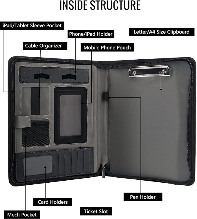 - 【LARGE CAPACITY】Multiple functions portfolio fits 8.5"x11" or A4 documents, a tablet sleeve, a phone/Pad holder, a phone pouch with Visible Window and charger hole, an elastic band for cables, a mesh pocket for USB stick, 6 card slots, a small ticket pocket and a pen holder. Neat and Practical Organized All Your Stuff. This super business binder padfolio is big enough to safely store what you need yet is compact, stylish & travel-friendly.