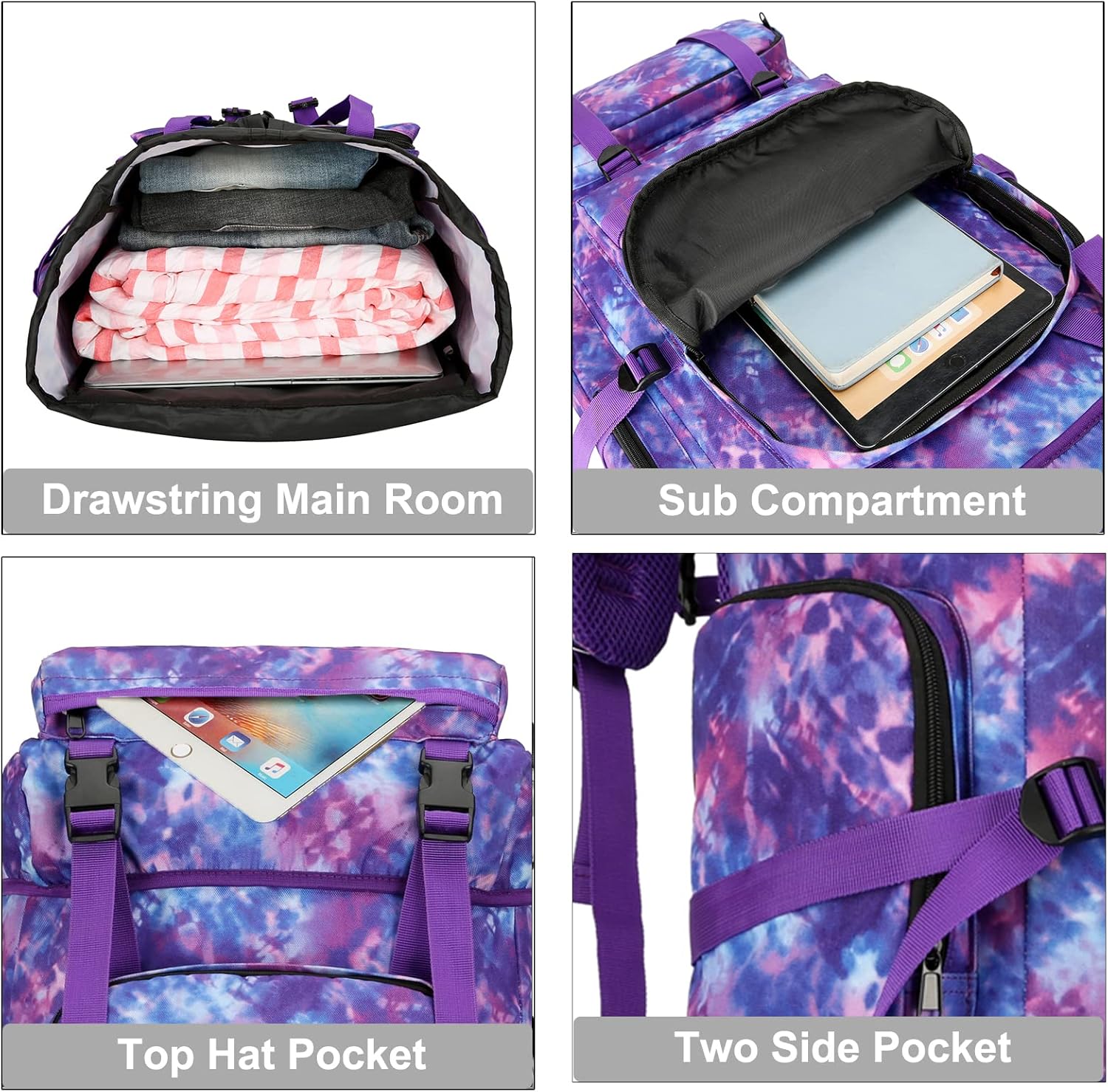 - 【Hiking Backpack Structure】: The 70L camping backpack main compartment is drawstring closed, hiking backpack roomy enough for you storage hiking gear, shoes and luggage, 1 laptop compartment, 1 front zipper pocket and 2 side pocket for separate and orderly storage.