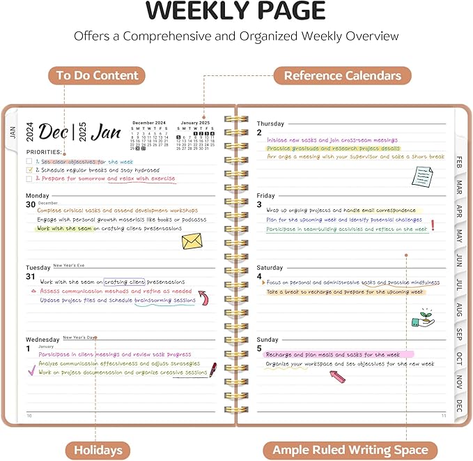 - Comprehensive Coverage: Our 2025 planner covers the entire year, from January to December, ensuring you're prepared for every month and week ahead. With 53 weeks included, you'll have plenty of room to plan, set goals, and track your progress toward success.