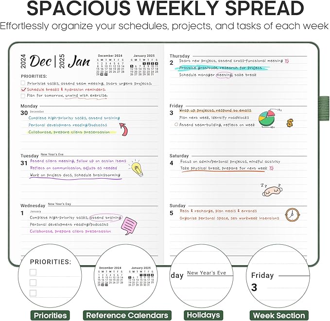 - Detailed Weekly Views: The weekly view pages offer plenty of space for daily schedules, appointments, and activities. Highlighted priority sections keep you focused on your most important goals. The weekly view pages help you organize and track your week efficiently, giving you a sense of accomplishment as you complete tasks.