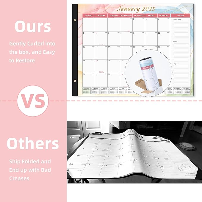 - 【Premium Thick Paper】With a weight of 0.264lb per sheet, the 2025 calendar is designed using premium thick paper, ensuring a high-quality writing experience. It is resistant to ink seepage, resulting in clean and crisp writing. To safeguard the calendar from dust and liquids, it comes with a transparent PVC cover. Two corner protectors are included to keep the pages flat. Plus, the cutting line allows for effortless tearing of each month's page. This desk calendar is perfect to long-term use.