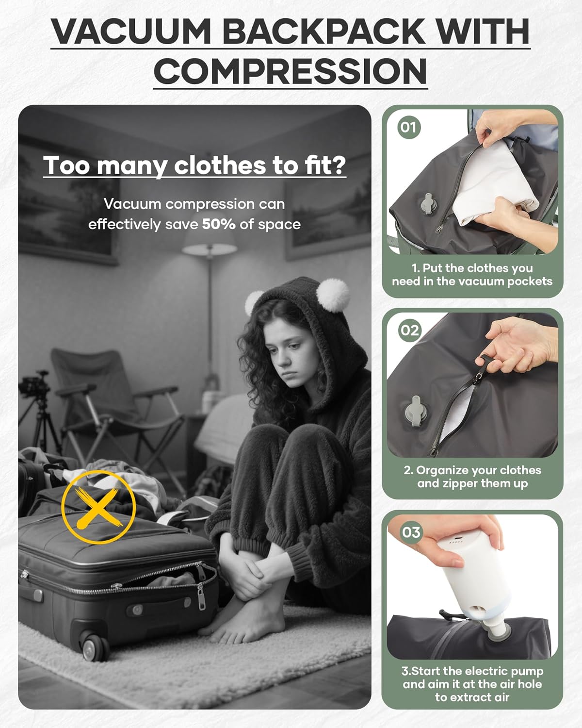Vacuum Backpack Travel With Pump,Mochila De Viaje Compresion Al Vacio,Personal Item Travel Backpack With Vacuum System,Large Carry On Vacpack Backpacks For Women Men,Olive Green